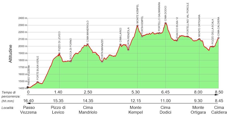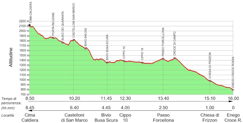 svolge lungo i sentieri CAI-SAT 205, 209, 826, 208, 835, 211, 206, 840, 841, 842, 869 e nel complesso è privo di particolari difficoltà se non in alcuni tratti. Il percorso é: Passo di Vezzena – Pizzo di Levico – Cima Mandriolo – Porta Manazzo – Cima Larici – Cima Portule – Cima Dodici – Monte Ortigara – Cima Caldiera – Castelloni di San Marco – Piana di Marcesina – Valmaron – Frizzon- Enego. Data la lunghezza ed il dislivello si consiglia di suddividerlo in almeno due o tre giorni.